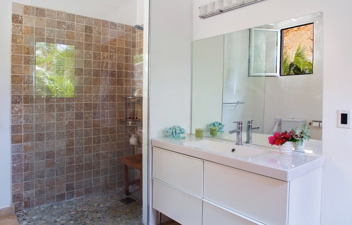 This hillside Villa has a total of four en-suite bedrooms (2 with queen beds, 2 with king beds), the villa is ideally set up for 8 people and has a private infinity pool with stunning ocean views and the beach is only a short 15 minute walk away.