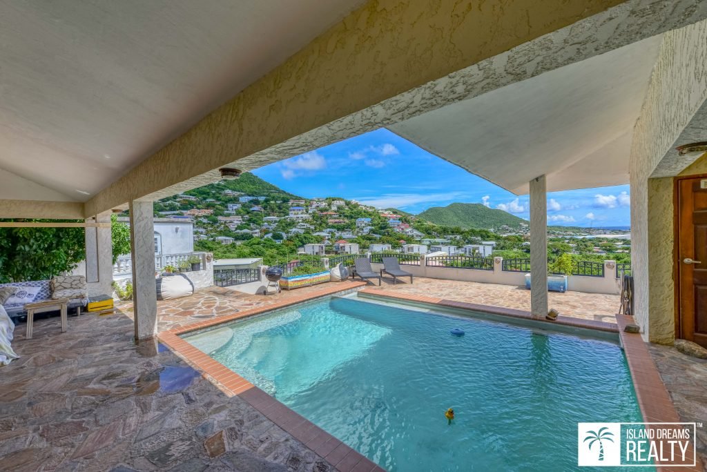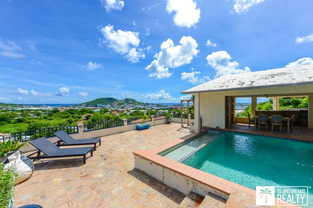 Above the garage you’ll find a spacious 1-bedroom apartment with access from the side of the building where there is also a little patio for this apartment. Directly above the apartment you have the lovely pool and deck with amazing sunset views of the Simpson Bay Lagoon, the runway and the Caribbean Sea. The pool deck/terrace is large and perfect for entertaining, with a spacious concrete gazebo. Under the gazebo you have a half bath and next to that a door that houses the elevator.