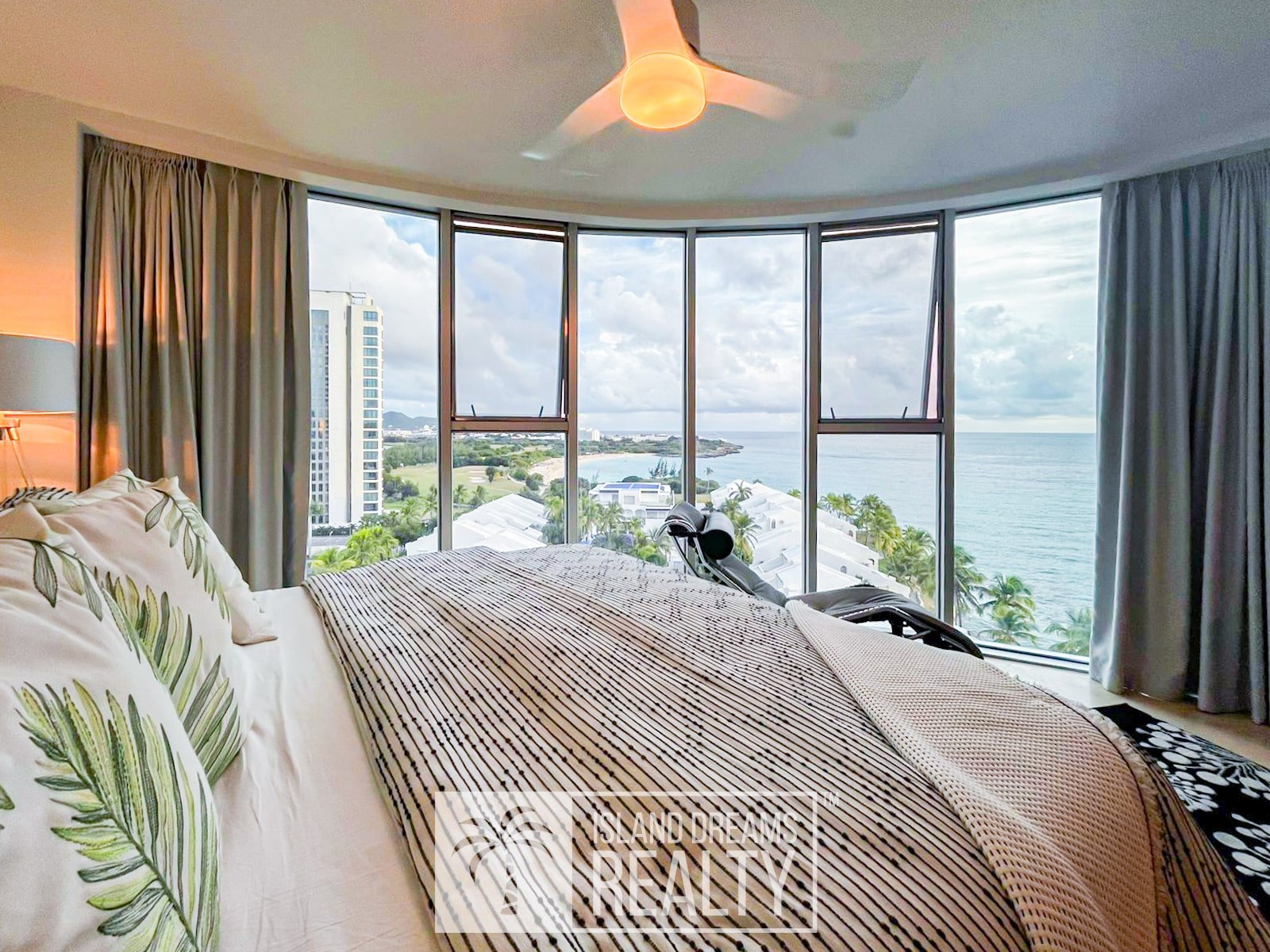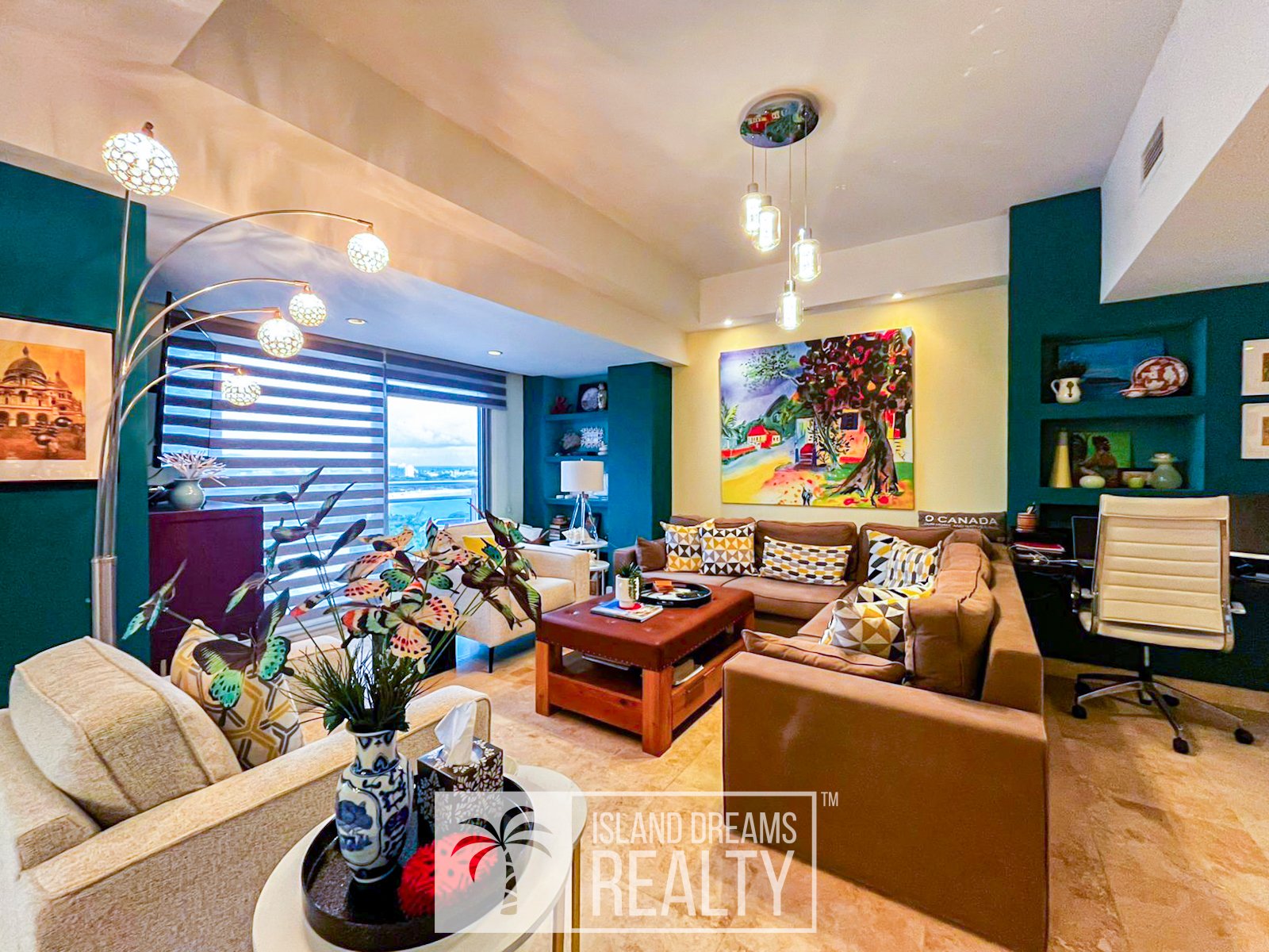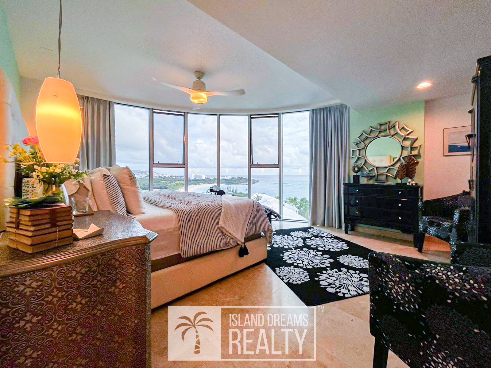 The living area and porch enjoy a south-east exposure, capturing gentle morning light, cooling breezes, and a serene sense of openness throughout the day. Inside, the residence feels immediately welcoming, defined by vivid colors and a distinctly homey elegance that softens its upscale design. Both bedrooms are impressively spacious, while the primary suite commands a breathtaking 180-degree ocean view, an uninterrupted panorama that defines coastal Caribbean living at its finest.