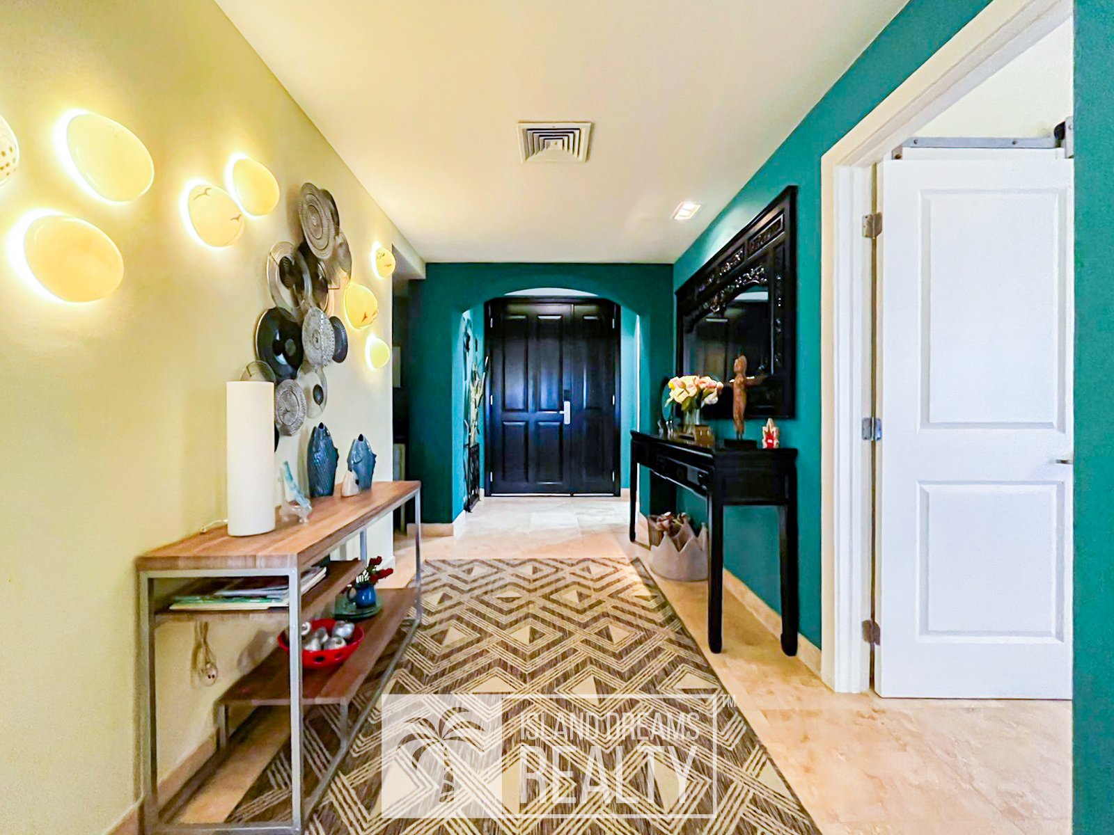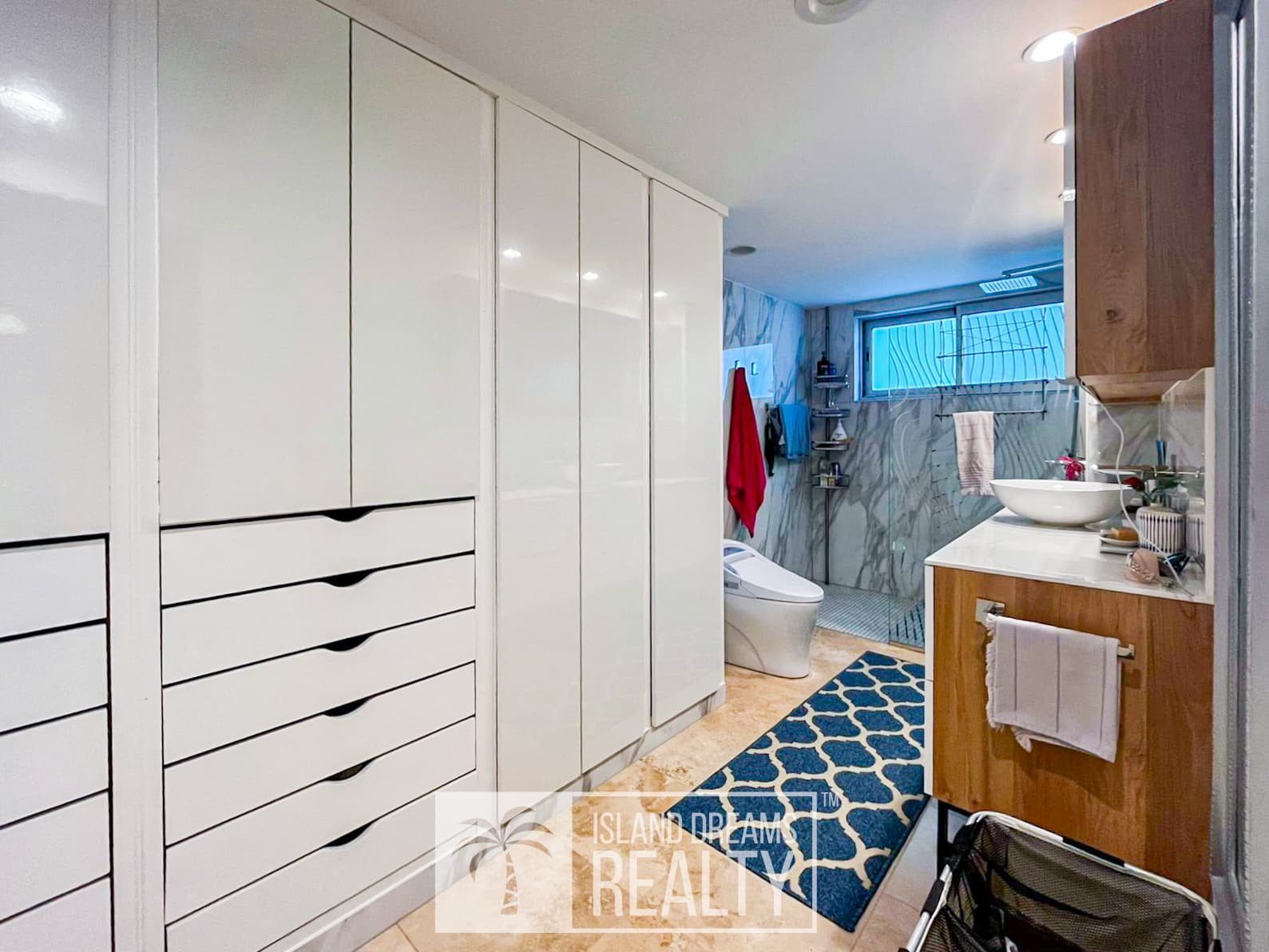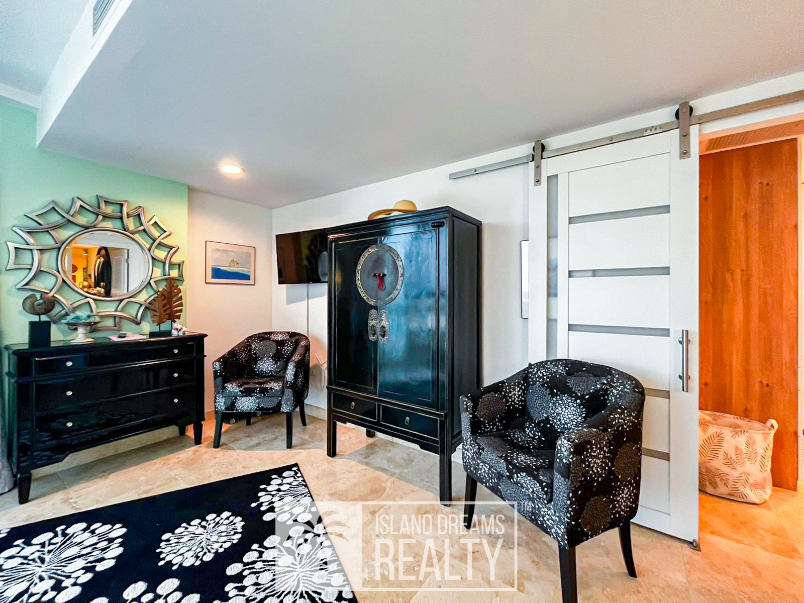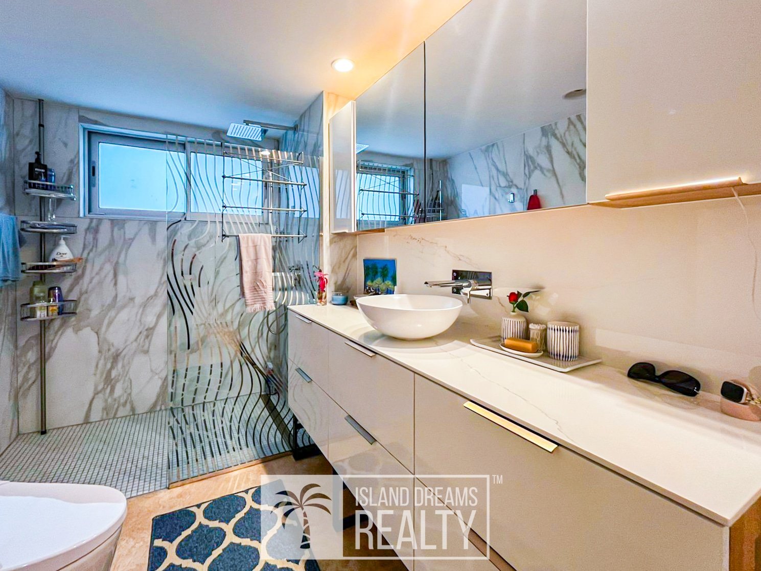 The living area and porch enjoy a south-east exposure, capturing gentle morning light, cooling breezes, and a serene sense of openness throughout the day. Inside, the residence feels immediately welcoming, defined by vivid colors and a distinctly homey elegance that softens its upscale design. Both bedrooms are impressively spacious, while the primary suite commands a breathtaking 180-degree ocean view, an uninterrupted panorama that defines coastal Caribbean living at its finest.